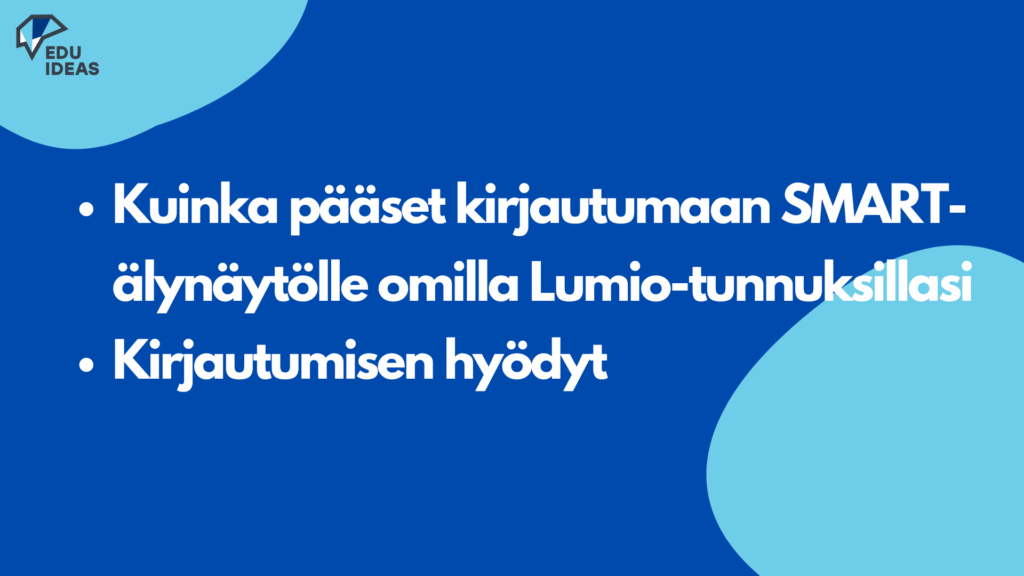 Tervetuloa kirjautumaan SMART-älynäyttöön. Aloita tästä osiosta ja opi, kuinka pääset kirjautumaan SMART-älynäytölle omilla Lumio-tunnuksillasi. Videon katsottuasi ymmärrät myös, mitä hyötyä kirjautumisesta on.