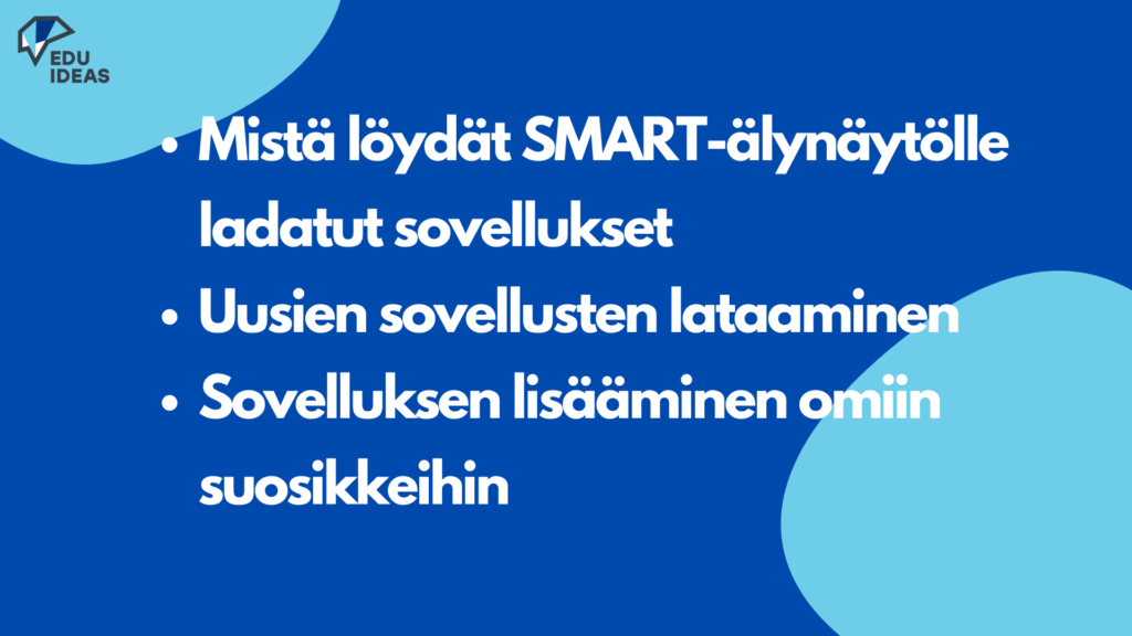 Tässä osiossa opit, mistä löydät SMART-älynäytölle ladatut sovellukset. Saat neuvoja, miten saat ladattua uusia sovelluksia sekä opit lisäämään sovelluksen omiin suosikkeihin.